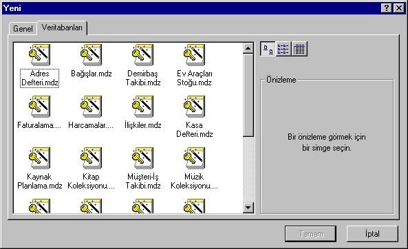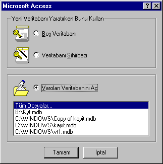 Yeni Bir Veri Tabanının Hazırlanması: Access`te yeni bir veri tabanı oluşturulması, Msoffice paketinde bulunan Word ve Excel gibi diğer programlarda yeni doküman ya da kitap oluşturma işlemine benzerdir. Access`in ilk açılışında, görüntülenen diyalog kutusunda Boş Veri tabanı seçeneği kullanılarak yeni bir veri tabanı oluşturulabildiği gibi, daha sonra da araç çubuğundan Yeni düğmesi basılmak ya da Dosya menüsünden Yeni Veri tabanı komutu seçilmek suretiyle de yapılabilir. Hangi yöntem kullanılırsa kullanılsın, yeni bir veri tabanı mutlaka bir şablon kullanılmak suretiyle oluşturulur. Herhangi bir şablon kullanılmak istenmiyorsa, bu durum da aslında yine bir şablon olan Boş Veri tabanı şablonu seçilmelidir. Bu şablon dışında başka bir şablon kullanılmak isteniyorsa, aşağıdaki diyalog kutusunda olduğu gibi mevcut şablonlardan birisi seçilebilir. Bazı şablonlar, bir sihirbazı devreye sokarak, oluşturulacak yeni veri tabanının yapısına ilişkin bazı bilgileri kullanıcıdan alırlar ve en son olarak da yeni veri tabanını oluştururlar.