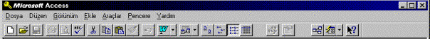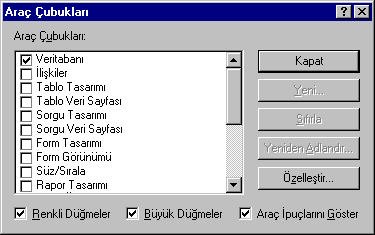 Başka araç çubuklarının görüntülenmesi ve araç çubukları ile ilgili değişik ayarlar yapabilmek için Görünüm menüsünden Araç Çubukları seçeneği seçilir. Aşağıdaki diyalog kutusunda, istenilen diğer araç çubuklarına ait kutuların işaretlenmesi ile başka başka araç çubukları da görüntülenebilir. Ancak bilinmelidir ki, Access programı, o anda yapılmakta olan işlem için gerekli olan araç çubuğunu otomatik olarak görüntüleyebilmektedir.