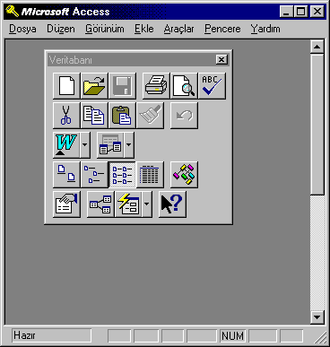 Başlık çubuğunun altında, menü seçeneklerinin yer aldığı menü çubuğu görülebilir. Buradaki menü seçenekleri, Access`in o anki moduna ve Access uygulamanızın özel bir menü sistemine sahip olup olmamasına göre değişiklik gösterecektir. Menü çubuğunun hemen altında, araç çubuğu yer alır. Access`te çok sayıda değişik araç çubuğu bulunmaktadır. Kullanıcının kendi araç çubuklarını da oluşturması mümkündür. Araç çubukları, sık gerçekleştirilen işler için birer kestirme gibi düşünülebilirler. Daha önce Access kullanmış olanlar için bile, araç çubuğundaki düğmelerin işlevlerini unutmak söz konusu olabilir. Araç çubuğundaki düğmelerden birinin üzerine mouse getirilip birkaç saniye beklenirse, küçük bir balon bu bileşenin işlevini açıklayıcı bilgi sunacaktır. Ayrıca en altta yer alan durum çubuğunun da kısa bir açıklama içerdiği görülebilir. Bu araç ipuçları kullanılarak her bir düğmenin ne işe yaradığı kısa sürede öğrenilebilir. 1.3. Araç Çubuklarının Düzenlenmesi Access ilk açıldığında, araç çubuğu tek bir satırdan oluşmaktadır. Bu çoğu zaman işe yarasa da, zaman zaman farklı bir düzen gerekli olabilmektedir. Araç çubuklarını başka bir konuma taşımak için, mouse, araç çubuğunun boş bir bölümüne getirilip sol mouse tuşu ile sürükleme yapmak gerekmektedir. Araç çubukları ekranın dört kenarına yaslanacak şekilde yerleştirilebildiği gibi, aşağıdaki şekilde görüldüğü gibi, orta yerde seyyar olarak da kullanılabilirler. Bu durumda, araç çubuğunun üst kısmında bir başlık kısmı açılarak, araç çubuğunun ismi görüntülenir.