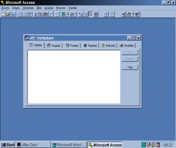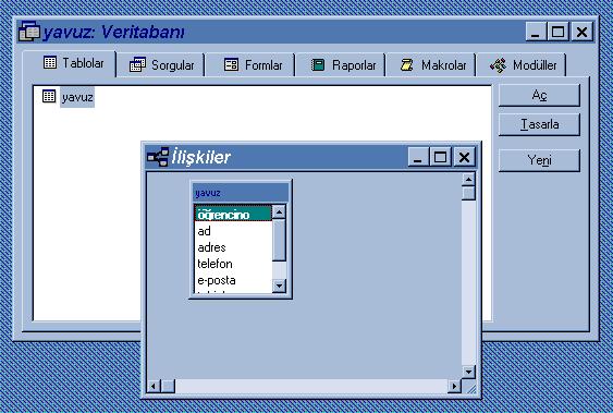 Access açılır. Açılış diyalog kutusunda Cancel tıklanır. Araç çubuğundaki New Database düğmesi tıklanır. Access bir dizi şablon içerisinden yeni veri tabanı için seçim yapılmasına olanak tanır. Blank database şablonu bulunur ve vurgulanır. OK tıklanır ve uzantısı .mdb olan yeni bir veri tabanı hazırlanmış olur. Create tıklanarak Access’in veri tabanı hazırlama işlemini tamamlaması sağlanır. 2.1. Wizard`a Giriş Hazırlanan yeni veri tabanı çerçevesi, kullanılacak bütün nesneler için bir kap durumundadır. Bu pencere üst bölümünde sekmelere ve yan tarafında da bir kaç düğmeye yer verir. 2.1.1. Wizard Kullanılarak Yeni Bir Tablonun Hazırlanması Veri tabanı penceresinin sağ tarafındaki New düğmesi tıklanır. Bir sonraki diyalog kutusunda da Table Wizard tıklanır. OK tıklayın. Br sonraki diyalog kutusunun sol alt bölümündeki Personal seçenek düğmesi tıklanır. Business ve Personal etiketli iki seçenek düğmesi, Wizard kullanılırken iki tablo tipi grubundan hangisinin kullanılacağını belirler. Sample Tables başlıklı liste kutusu, yeni tablo için şablon olarak kullanabilecek tabloları içerir. Sample Fields liste kutusu ise her bir örnek tabloda kullanabilecek alanları gösterir. Table Wizard`ı kullanırken istenene yakın alanları içeren örnek bir tablonun seçilmesi uygun olacaktır. Personal etiketli seçenek düğmesi tıklanarak kişisel örnek tablo kümesi görüntülenir. Farklı tabloların bir arada çalışabileceği unutulmamalıdır. Örnek bir tablo tıklandıktan sonra >> düğmesi tıklanırsa örnek tablodaki verinin tümü yeni tabloya taşınacaktır. Yeni tabloya örnek tablodan sadece bazı alanlar eklenecekse, bu alanlar vurgulanır ve > düğmesi tıklanır. Yeni tablodan alan çıkartmak içinse < ve << düğmeleri kullanılmalıdır. Fields in my new table liste kutusuna istenen bütün girişler yerleştirildikten sonra, Next> düğmesi tıklanarak tablo tasarımının bir sonraki aşamasına geçilir. Access tablo için Authors adını önerecektir,bu ad kabul edilir ya da başka bir ad kullanılır. Access ana anahtar (primary key) seçenek düğmesine geçerek kullanıcı için ana anahtarı hazırlayacaktır. Varsayılan bu durumun geçerliliği korunur ve Next> tıklanır. Access, Wizard işleminin tamamlanmak üzere olduğunu belirten bir ekran görüntüleyecektir. Bu noktada tablo tasarımını değiştirme, tabloyu veri girişine açma ya da form hazırlamak için başka bir Wizard`ı etkinleştirme seçenekleri sunulacaktır. "Enter data directly into the table"`ı ve Finish düğmesi tıklanır. Access yeni tabloyu hazırlayıp açacaktır. Şu andan sonra TAB ve ENTER tuşlarıyla alanlar arasında gezebilir ve veri girişi yapılabilir. İlk alana hiçbir bilgi girilemediğine dikkat edin. Bu alan Access`in alanları belirlemek için kullandığı ardışık numaralara ayrılmıştır. Tablonun kullanımı sona erdiğinde kontrol menüsü ikonu çift tıklanarak ya da sağ üstte yer alan X düğmesi tıklanarak tablo kapatılabilir. Eğer alan genişlikleri değiştirildiyse bu değişikliklerin kaydedilmek istenip istenmediği sorulacaktır.
