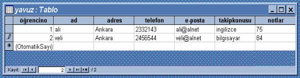 4.2. Alan Ekleme Access veri tabanlarına kolaylıkla yeni alanlar eklenebilir. 4.2.1. Bir Tabloya Alan Eklenmesi Field Name alanı kaydırılarak Takip Konusu başlığı bulunur. Mouse Field Name sütununun sol kenarına taşınır. Gösterge, sağ yönü gösteren bir oka dönüşecektir. Sol mouse düğmesi tıklanır. Access satırın tamamını vurgulayacaktır. Tıklarken, mouse göstergesinin Takip Konusu alanının hemen solundaki gri bölümün dışına çıkmamasına dikkat edilmelidir. Takip Konusu satırı tümüyle vurgulanmış durumdayken, Insert tuşuna basılır. Access yeni ve boş bir satır yerleştirecek ve takip Konusu alanını bir satır aşağı kaydıracaktır. Vurgulanan satırın Field Name sütunu bir kez tıklanır. Satırın vurgusu kaybolacak ve gösterge Field Name sütununun en solunda yer alacaktır. Şimdi Köken sözcüğü girilir. Tab tuşuna basılarak gösterge Data Type sütununa taşınır. Access Text veri tipini önerecek ve ayrıca Data Type alanının sağında bir sekme sunacaktır. Sekmeyi tıklayarak liste açılır. Text, Köken alanı için doğru veri tipidir. Ancak diğer seçenekleri görmek için aşağı ok düğmesi tıklanabilir. Böylece Öğrenci Bilgi tablosuna yeni bir alan eklenmiş olur. Kontrol menü ikonu çift tıklanarak ya da X düğmesi kullanılarak Öğrenci Bilgi tablosu kapatılır. Access tabloda yapılan değişikliklerin kaydedilmesinin istenip istenmediğini sorunca, OK tıklanır. 4.3. Wızard`sız Tablo Hazırlama Wizard`ın örnekleri istenen tabloya yakın özellikler sunmuyorsa, kullanıcı kendi tablosunu hazırlamalıdır. Örneğin, öğrenci kimliği ile ilgili alan sayesinde Öğrenci Bilgi tablosuyla bağlantı kuran ve öğrencilerin ders kayıtlarıyla ilgili bir tablo kurulacaksa ve bağımsız tabloda karşılık gelen bir kayıt yoksa, bağımlı tabloya bilgi eklenemez. İki tablo bağladıktan sonra, Öğrenci Bilgi tablosuna öğrenciyle ilgili bilgi girilmediği sürece, bir derse yeni bir öğrenci kaydedilemeyecektir. Yeni tablo ders kodu, öğrencinin dersi bitirip bitirmediğine ilişkin bir gösterge ve öğrencinin notu için de alanlara gereksinim duyacaktır ve her sömestr bu tablo başka bir tabloya veri sağlayarak öğrencinin karnesinin hazırlanmasını sağlayacaktır. 4.3.1. Tablonun Hazırlanması Öğrenci Bilgi tablosunu kapandıktan sonra, Tables sekmesinde veri tabanı penceresine dönmüş olunur. 4.3.2. Wizard Kullanmadan... New düğmesi tıklanarak tablo hazırlama işlemine başlanır. Design View seçilir ve OK tıklanır. Access boş bir tablo tasarım bölümü açacaktır. Işıklı gösterge, tasarım alanının en solundaki sütunun ilk satırında yer alacaktır. İşlem sırasında sağ alt bölümde ve durum çubuğunda görüntülenen açıklamalar kullanıcıya yardımcı olacaktır. İlk alan adına İndeks No deyimi girilir. Tab`a basarak Data Type alanına geçilir. Access Text veri tipini önerecektir. Yandaki sekmeyle açılacak listeden, Autonumber veri tipi bulunur ve tıklanır. İndeks No alanı, bu tablo için anahtar alan olma işlevini üstlenecektir. Autonumber veri tipinin kullanılması sayesinde, Access bu tabloda hazırlanacak her bir kayıt için bu alana diğerlerinden farklı bir sayı girecektir. Ekranın alt bölümünde New Values alanının, Increment olarak ayarlandığına dikkat edilmelidir. İkinci alan, Öğrenci Bilgi tablosuyla bağlantıyı sağlayacak olan Öğrenci Sigorta No alanıdır. İki kez Tab`a basılarak Field Name sütununun ikinci satırına geçilir. Öğrenci Sigorta No deyimi girilir. Data Type alanına geçilir. Access`in sunduğu varsayılan ayarlar kabul edilir ve iki kez Tab`e basılarak bir sonraki satıra geçilir. Öğrenci Bilgi tablosunda Text veri tipine sahip olan Öğrenci Sigorta No alanının, yeni tabloda da Text veri tipine sahip olduğu gözlenmelidir. Bir sonraki satıra geçtikten sonra, Ders Kod deyimi girilir. Yine Data Type sütununa geçilir, Access`in varsayılan ayarlamaları kabul edilir ve iki kez Tab`e basılarak Field Name alanındaki dördüncü satıra geçilir. Yeni alanın adı Bitirdi olarak girilir ve veri tipi olarak Yes/No seçilir. Bir sonraki Field Name satırına geçilir. Son alan için Not deyimi girilerek alanlara ad verme işlemi tamamlanır. Son alanın veri tipi Text olarak bırakılır. Bir not Access`in alan boyutu için sunduğu 50 boşluğu tamamıyla kaplamayacaksa, Field Properties bölümündeki Field Size satırı tıklanarak varsayılan değer düşürülür. Access`e İndeks No alanının, anahtar alan olarak istendiği belirtilir. Tablo tasarım bölümündeki ilk sütunun ilk satırı (İndeks No alanı) tıklanır. Araç çubuğunda küçük bir anahtarla temsil edilen düğme bulunur. Bu düğme tıklanır. İndeks No alan adının hemen solunda küçük bir anahtar görüntülenecek böylece İndeks No`nun anahtar alan olarak ayarlandığını gösterecektir. Bu tabloya bir ad verip kaydetmek gerektiğinde, File menü maddesi tıklanır ve Close seçilir. Access yapılan değişikliklerin kaydedilmek istenip istenmediğini soracaktır. Yes tıklanır. Ad sorulduğunda, Öğrenci ve Ders deyimi girilir. OK tıklanır. Access tabloyu kaydedecektir. 4.4. Neden İlişkisel? Öğrenci ve Ders tablosunda öğrenci olmayanlara ilişkin hiçbir giriş istenmeyecek ve ayrıca alınan dersleri öğrencilerle gerektiği gibi eşleme gereksinimi duyulacaktır. Access gibi ilişkisel bir veri tabanında, bağlar bu iki işlevi de yerine getirmektedir. Öğrenci Bilgi ve Öğrenci ve Ders tabloları arasında bağlantı kurulmasının doğrulama ve eşleme olmak üzere iki nedeni vardır. Doğrulama, Öğrenci ve Ders tablosunda hatalı veri bulunmamasını sağlar. Amaç, bir öğrenci için Öğrenci ve Ders tablosuna bir giriş yapmadan önce, bu öğrenciyle ilgili kayda Öğrenci Bilgi tablosunda da yer verildiğinden emin olmaktır. Ayrıca tek bir öğ