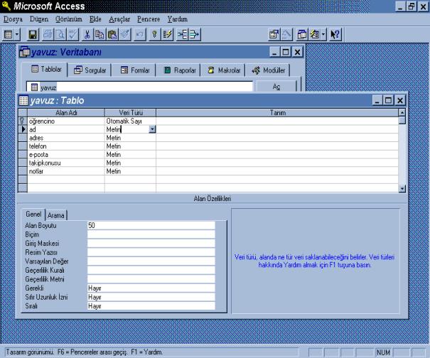 3.1.5. Öğrenci Bilgi Tablosunun Hazırlanması Table sekmesinin seçildiğinden emin olunur. Database kutusu içindeki New düğmesi tıklanır. Access bazı seçenekleri sunacaktır. Bunlardan ilk ikisi olan Data sheet View ve Design View, elle tablo hazırlama seçenekleridir. Son iki seçenek olan Import Table Wizard ve Link Table Wizard varolan tabloların veri tabanına bağlanmasını ya da aktarılmasını sağlar. Table Wizard seçilir ve OK tıklanır. Sol alt köşedeki Business seçenek düğmesinin işaretli olmasına dikkat edilmelidir. Mouse`la Sample Tables listesi gerekirse kaydırılır ve Öğrenciler tablosu bulunur ve tıklanır. Access kullanıcı için işleri kolaylaştıracaktır. Sample Fields liste kutusu incelenirse, istenen alanların hemen hemen tümünün İngilizce olarak içerdiği görülecektir. Sample Fields liste kutusunun hemen sağındaki >> düğmesi tıklanarak örnek alanların hepsinin tabloya aktarılması sağlanır. Öğrencilerin hepsi Türkiye`de olacağı için, Postal Code alanı ve Rename tıklanıp alan Posta Kod olarak adlandırılabilir. OK tıklanarak yeni ad kabul edilir. State Or Province alanı da aynı şekilde Ülke olarak değiştirilebilir. Rename seçeneği kullanılarak bütün alanlar Türkçeleştirilebilir. Table Wizard`ın sağ alt bölümünde yer alan Next> düğmesi tıklanır. Access tablo için Students adını önerecektir, ancak bunun yerine Öğrenci Bilgi adı kullanılır. Wizard diyalog kutusunun ortasına geçilir ve No, set the Primary Key seçilir. Next> tıklanarak sıradaki diyalog kutusuna geçilir. Kimlik olarak öğrenci sigorta numarası kullanılacağından her bir kayıt için ayrı bir öğrenci kimliği söz konusu olacaktır. Access`in her bir kayıt için ayrı bir öğrenci kimliği kullanma konusundaki önerisine uyun. Öte yandan ortadaki diyalog kutusunda en alt seçenek kullanılarak, ana anahtar alanda hem harf hem de rakamların kullanılabilmesi mümkün kılınır. Next> düğmesi tıklanır. Access kullanıcıya son olarak üç seçenek daha sunacak ve Wizard`ın sonunda olduğunu belirtecektir. Eğer seçili değilse, en üstteki seçenek tıklanarak Access`e son olarak tablo tasarımı üzerinde oynamak istendiği bildirilir. Finish tıklanır. Access yeni tabloyu hazırlayacak ve kullanıcıyı Design View görüntüsünde bırakacaktır. 3.1.6. Alan Tipleri Ve Özellikleri Tablo tasarım penceresinin en üst bölümü, alan adları ve veri tiplerine ilişkin bir liste içermektedir. Pencerenin altında, General ve Lookup adlı iki sekmeye yer veren Field Properties adlı bir bölüm bulunmaktadır. Access tablosundaki her bir alan, üç bileşene sahiptir: Alan adı (kimlik gibi), alan tipi (Text gibi) ve özellikler. Veri tabanındaki her bir alanın uygun bir alan tipine ayarlanması önemlidir. 3.1.7. Veri Tipleri Access, şu veri tiplerini desteklemektedir. Metin (text): Alphanumeric olarak da bilinir. Normal karakterleri kabul eder. Alan uzunluğu 255 karakterle sınırlıdır. Sayı (number): Bu veri tipi sayıları kabul eder. Alanlar üzerinde matematik işlemler yapılması planlanıyorsa, bu veri tipi kullanılmalıdır. Tarih/saat (date/time): Number veri tipinin özel bir biçimi olan Date/Time, tarih ya da saat bilgisinin girilmesi için kullanılır. Bu tip veriye sahip alanlarda da matematik işlemleri yapılabilir. Para (currency): Para bilgisinin girilmesini sağlayan bu veri tipi de, Number`ın değişik bir uyarlamasıdır. Otomatik numaralama (autonumber): Bir alandaki verinin tipi Autonumber yapıldığında, Field Property New Number`ın Increment olarak ayarlanması durumunda Access kayıtlara ardışık sayılar uygulayacaktır. Random`a uyarlandıysa, Access her bir yeni kayıt için gelişigüzel sayılar üretecektir. Increment olarak ayarlandığında Access numara vermeye 1`den başlar. Increment ya da Random seçenekleri, ana anahtar alanlar için kullanılır, çünkü Access bir tablodaki kayıtlardan birine atanmış bir sayıyı bir daha kullanmayacaktır. Bu tip alanların gereksiz kullanımı veri tabanını gereksiz bilgilerle doldurarak ilişkisel teoriye ters düşecektir. Evet/Hayır (yes/no): Yalnızca iki değer kabul eder: Yes ya da No. Arama Wizard`ı (lookup wizard): Diğer veri tabanı nesnelerine önceden girilmiş olan değerleri arar. OLE nesnesi (OLE Object): OLE`yi destekleyen başka bir programda hazırlanmış bir nesnenin yerleştirilmesini ya da nesneye bağlanılmasını mümkün kılar. Access 95, yalnızca bir OLE müşterisi durumunda olduğu için, OLE`yi destekleyen diğer programlara yerleştirilebilen nesneler hazırlayamaz. Not (memo): Bir kayda not eklenmesini sağlayan bir alandır. 4. TABLO ALANLARININ ÖZELLİKLERİ 4.1. Bir Tablonun Düzenlenmesi Access`de bir tablonun hemen hemen bütün özellikleri değiştirilebilir. Aynı amaçla bir wizard da kullanılabilir. Çoğu zaman tablo tasarlandıktan sonra belirli bir alandaki veri tipinin yanlış olduğu ya da bir alanın eklenmesi veya çıkarılması gerektiği fark edilecektir. Örnek tabloda da etkin kökeni belirten bir alan eklenmesi ve fazlalık Student Number alanının çıkarılması gerekmekte. Uygun tablo tasarım alanını tıklayıp istene değişiklikler şu şekilde yapılmalıdır. Access, Okul veri tabanı, yada Öğrenci bilgi tablosu kapalıysa yeniden açılmalıdır. Öğrenci bilgi tablosu vurgulanmış durumdayken, veri tabanı penceresindeki Design düğmesi tıklanır. Student Number alanı bulunur. Mouse, alan adının hemen solundaki gri bölüme getirilir ve göstergenin sağ yönü gösteren bir oka dönüştüğü gözlemlenir. Sol mouse düğmesi tıklanarak alanın tamamı vurgulanır. Del tuşuna basılır. Student Number alanı silinecektir.